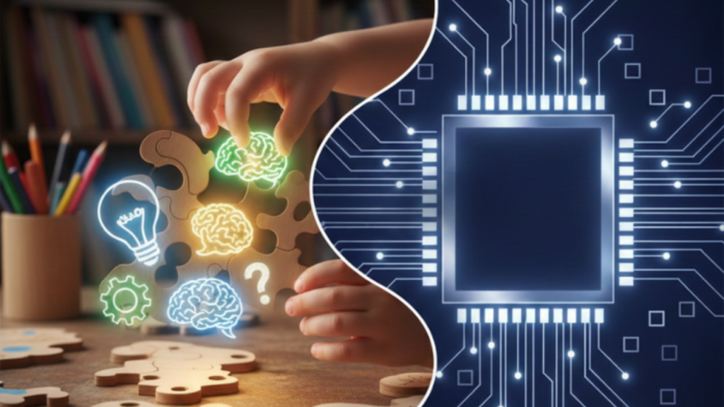 Human intelligence—especially in kids—is built on curiosity, experimentation, failure, and imagination. Children connect ideas from play, real-life experiences, and creativity in ways no algorithm can replicate.